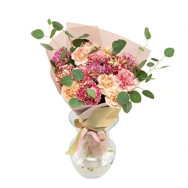 See kaunitest maaliliselt malbetes toonides lillekimp koosneb erivärvilistest nelkidest ja kimburohelisest, dekoratiivpaber ja pael loovad maalilisele kimbule viimistletud raami.