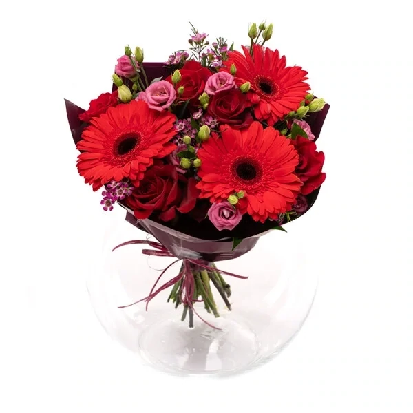 Imeline punastes toonides lillekimp gerberatest ja roosadest preeriakelladest, punastest roosidest ja hooajalisest kimburohelisest - see imekaunis lillekimp sobib saatmiseks igaks sündmuseks ja ei jäta kedagi kümaks.
