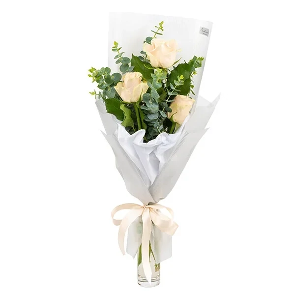 Klassikaline lillekimp heledatest roosidest, ilmestatud trendika kimburohelise ja dekoratiivpaberiga. Trendikas valik, mis sobib kinkimiseks igal tähtpäeval!